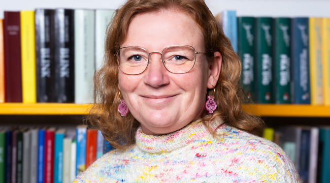 Stine fortæller, hvad hun får ud af at være en del af Strik og lyt på Horsens Bibliotek.